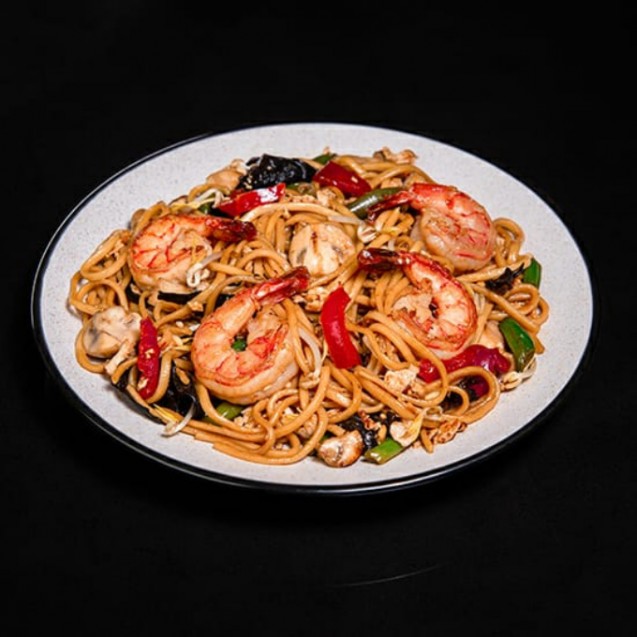 Локшина, креветки, капуста цвітна, броколі, перець болг., печериці, яйце, пармезан, вершковий соус.