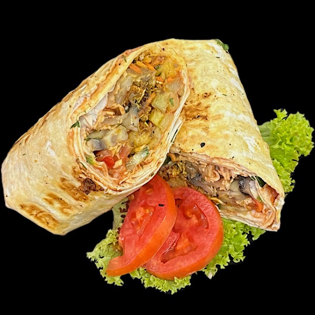 Лаваш, куряче стегно, помідор, огірок маринований, сир, морква по-корейськи, капуста, соус кінтукі, зелень, спеції.