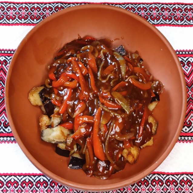 Баклажан, перець болг, перець чілі, цибуля.